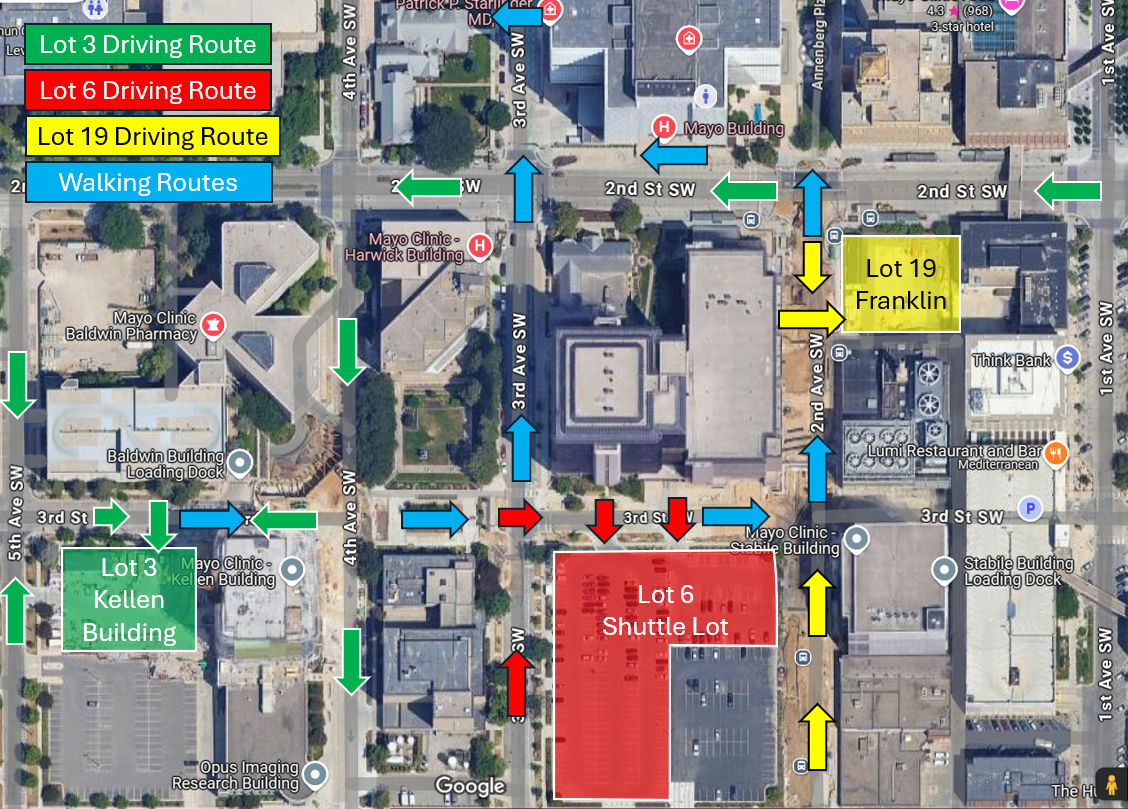 - Mayo Lot 3, which is directly west of the Kellen Building, on the corner of 3rd Street and 5th Avenue, is accessible by turning right on 3rd Street. This lot is valet parking during the week but open to the public on Saturdays and Sundays.